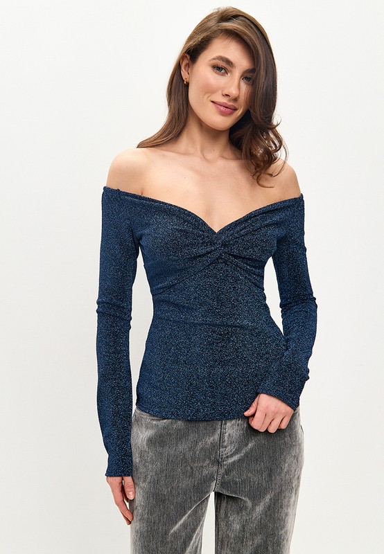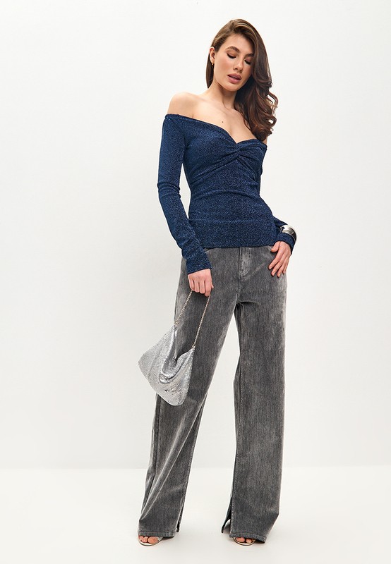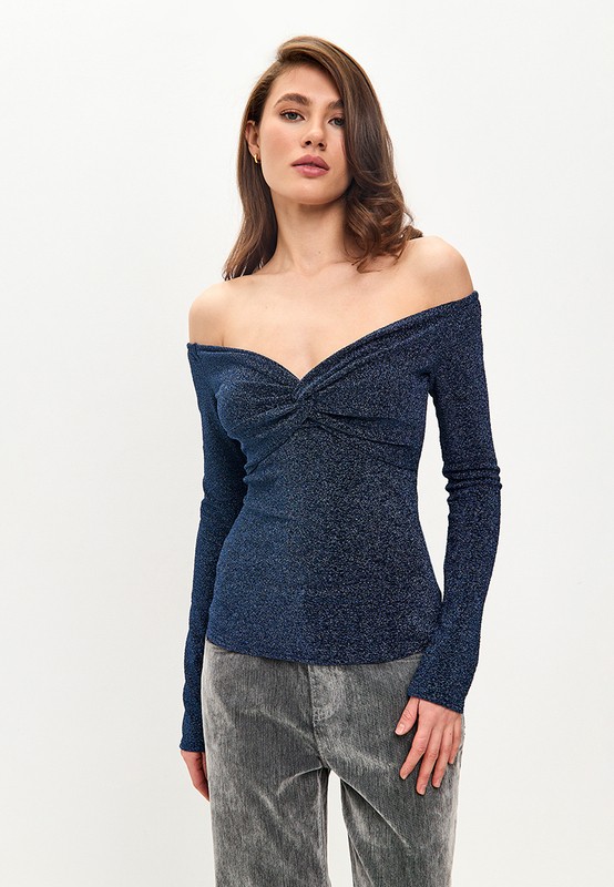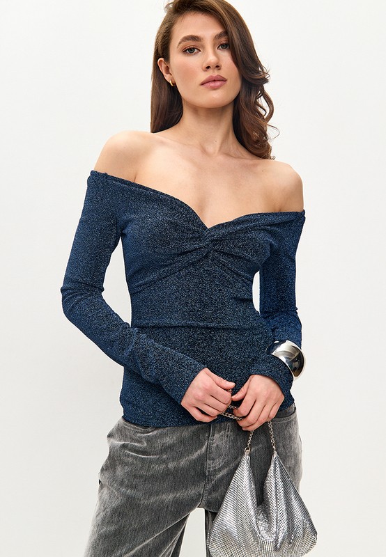 Блуза с открытыми плечами, фигурной линией декольте и драпировкой на лифе. Модель, которая приковывает взгляды. Вечерняя и одновременно комфортная блуза.