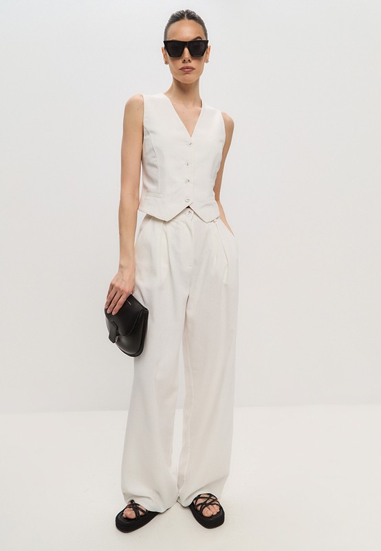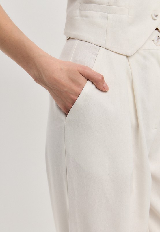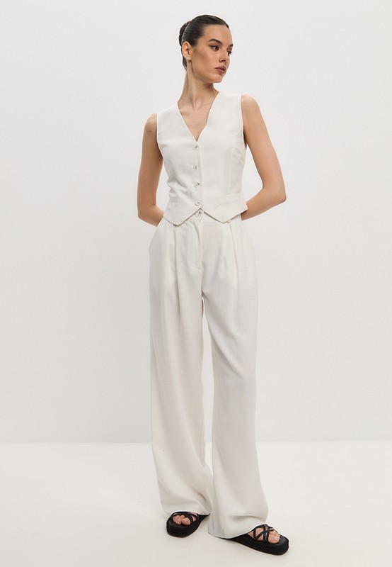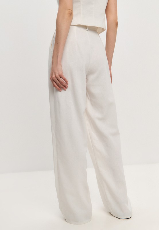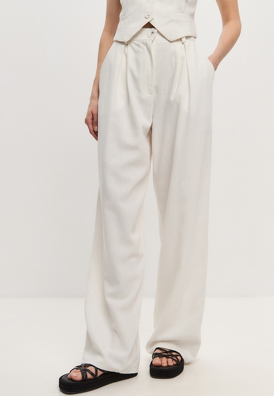 Брюки палаццо свободного кроя, с двумя складками на поясе и дополнительными шлейками для ремня. Модель выполнена из натурального льна с вискозными волокнами. Сочетайте брюки с жилетами из нашей базовой летней коллекции или носите с рубашками в более повседневных образах.