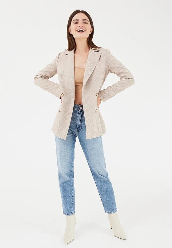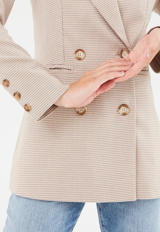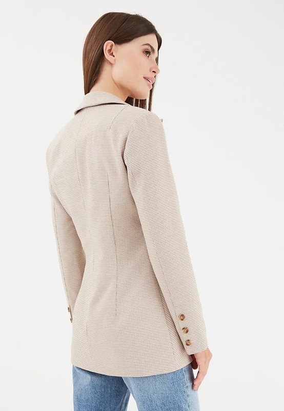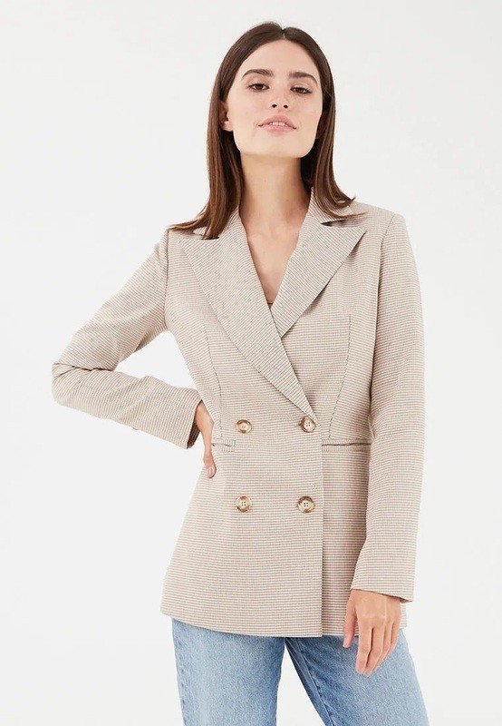 Двубортный жакет из премиальной костюмной ткани с 70% шерстью в составе. Приталенный крой создает изящный силуэт. Модель легко стилизовать и с юбками, и с джинсами.