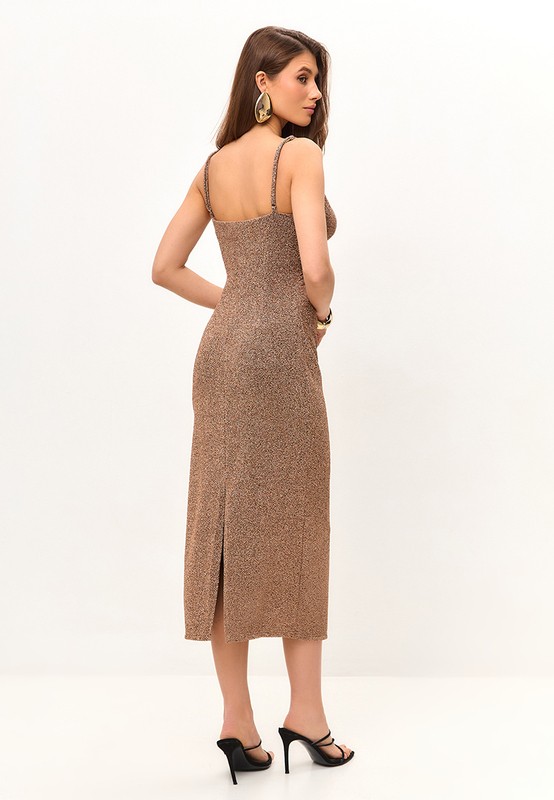 Платье облегающего силуэта с изящным вырезом. Модель, которая приковывает взгляды. Главным акцентом является фигурный вырез с драпировкой на лифе и вырез над талией. С помощью регулируемых бретелей платье можно корректировать под свой рост. Без застежки. Материал - эластичный трикотаж с люрексом.