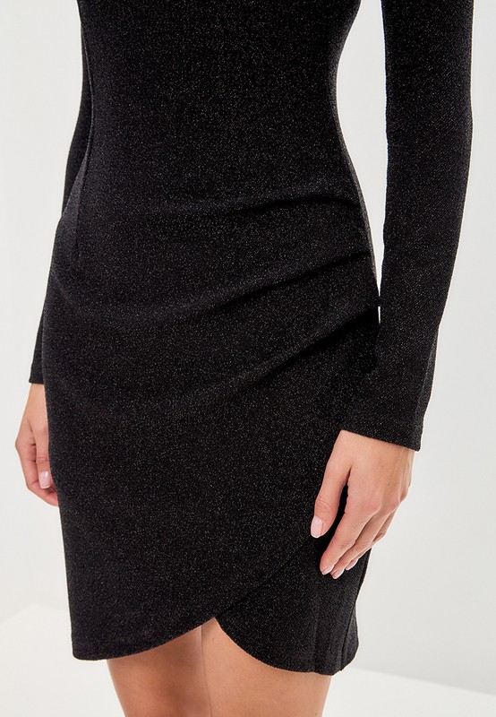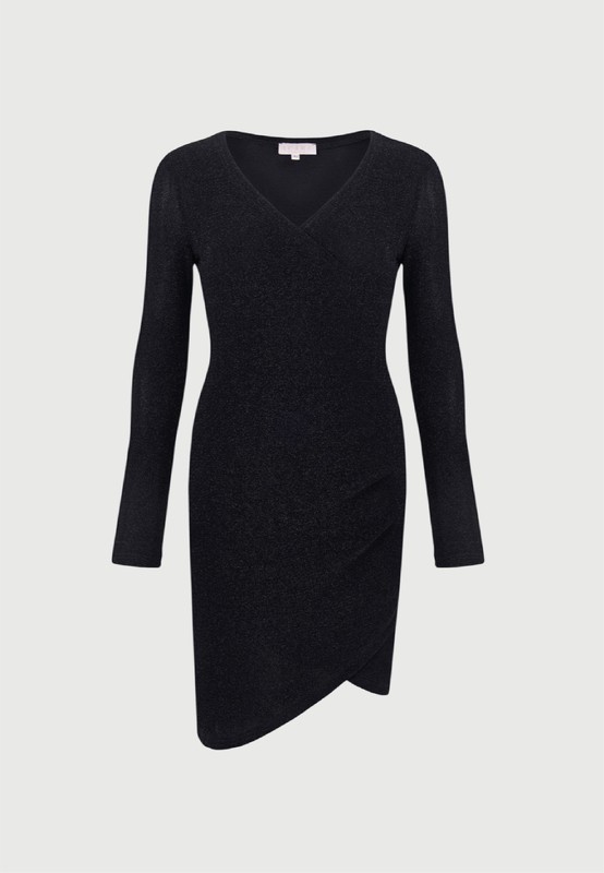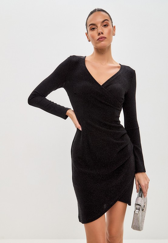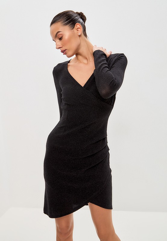 Женственное платье на запах с драпировкой. Благодаря приталенному силуэту, сборке и ассиметричному низу платье садится идеально по фигуре. Мерцающий трикотаж с люрексом имеет исключительные свойства- не мнется, комфортный и эластичный, а деликатное сияние ткани приковывает взгляды.