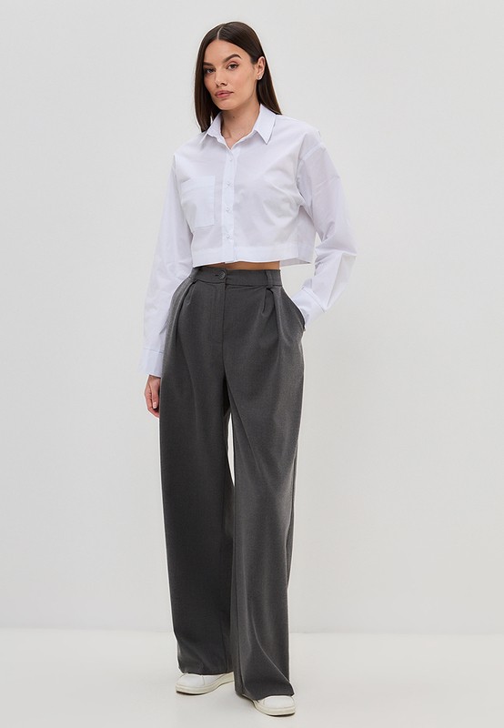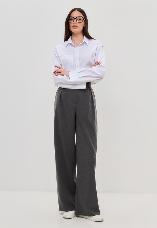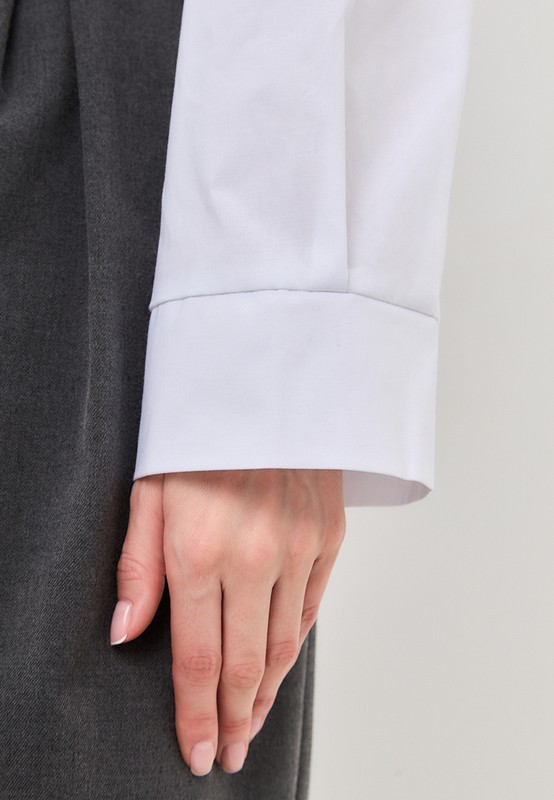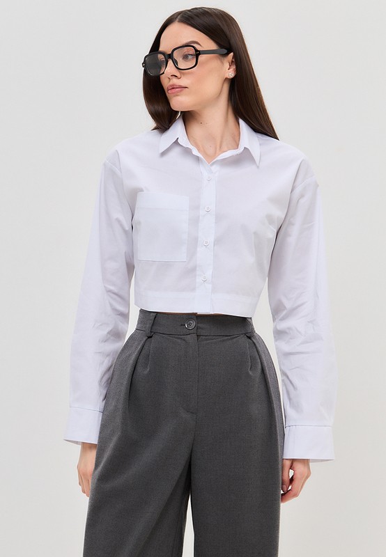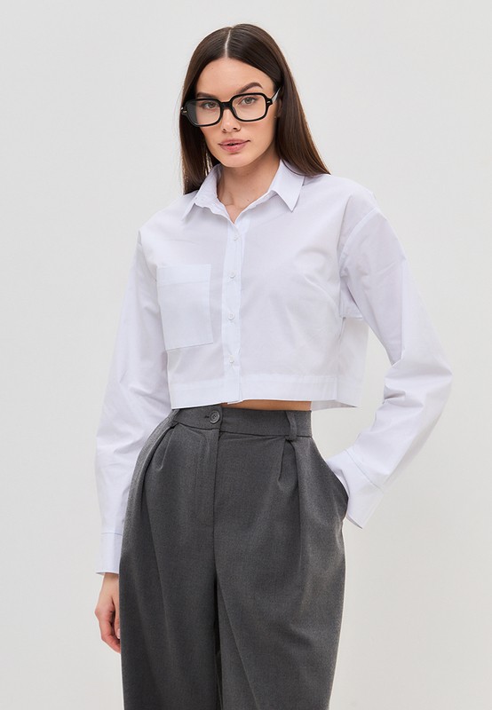 Укороченная рубашка oversize с отложным воротником. Эта рубашка универсальна: она впишется и в расслабленный casual, и в классический офисный образ. Так же ее можно носить как второй слой поверх кроп-топа.