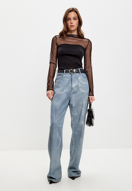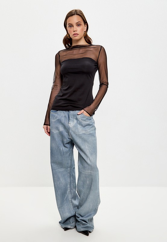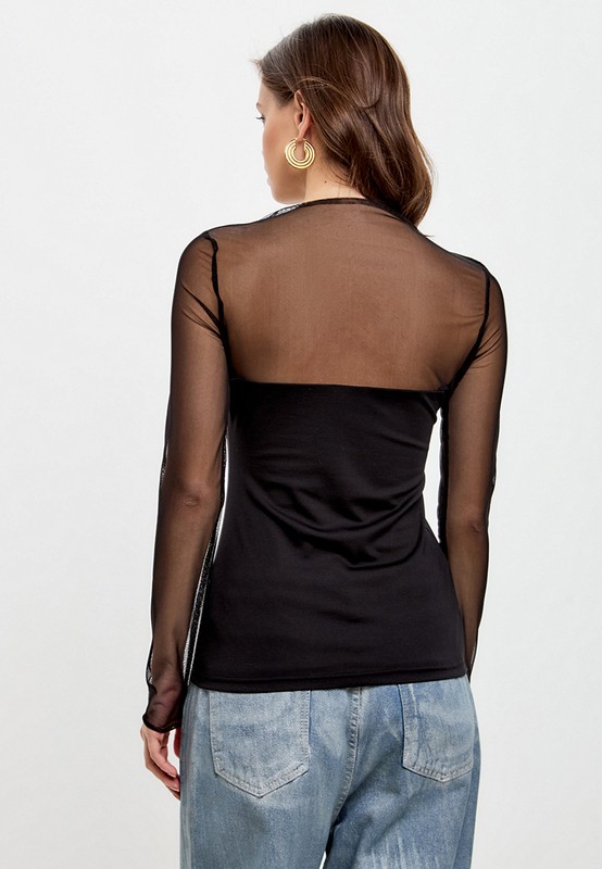 Водолазка с полупрозрачным верхом. Совмещение трикотажной основной части и верхней части с сеткой, графично выделяет линию груди. Полупрозрачный верх и рукава создают эффект тонкой вуали, благодаря чему водолазка легко впишется как в базовый гардероб так и в вечерние образы.