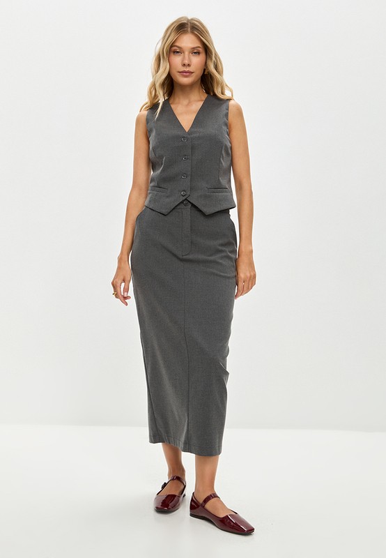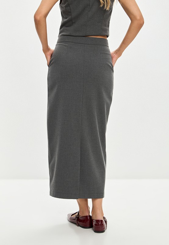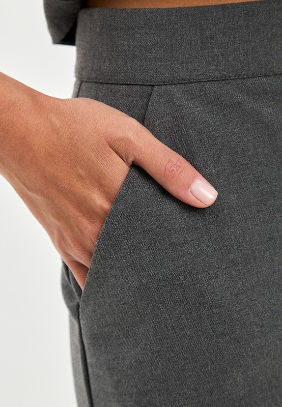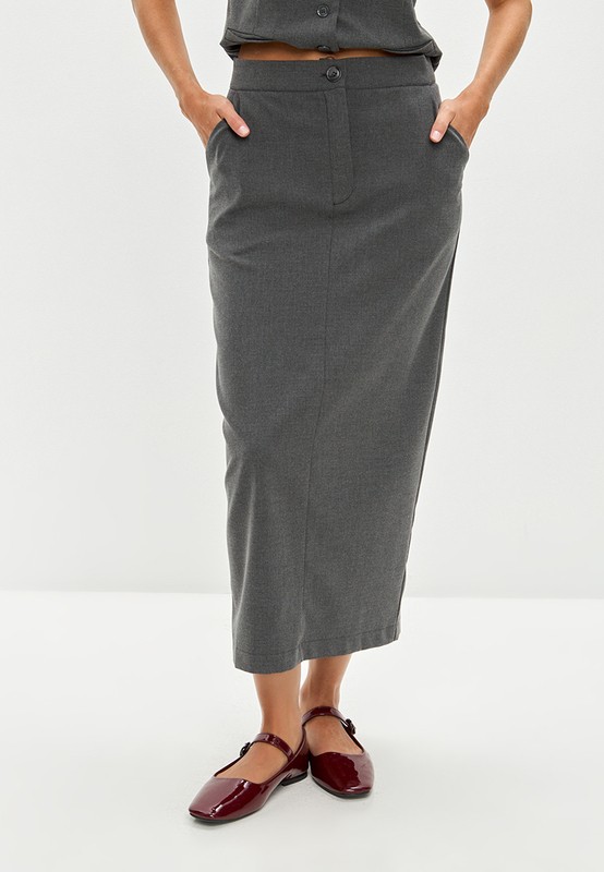 Юбка прямого силуэта на поясе с гульфиком - застежкой как на мужских брюках. Посадка на талии. Удобные карманы и разрез сзади юбки для комфортного движения.